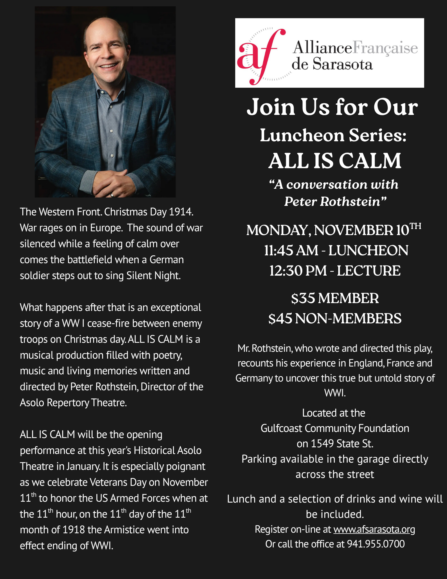 Mr. Rothstein will join us on the Eve of Veterans' Day to relate his journey in the creation of this award-winning play, "All is Calm: The Christmas Truce of 1914." Produced by theatre companies around the globe. Peter's surprising true story will leave you amazed at the kindred spirits we find in the most unusual places.